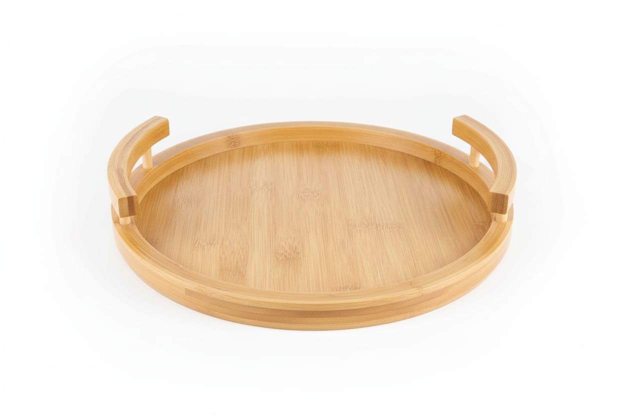Bandeja Redonda de Bambu (Base Principal): Com um design elegante e alças laterais, esta bandeja não é apenas uma base para as outras peças, mas um item multiuso. Perfeita para servir café da manhã, petiscos, ou como um elegante centro de mesa. Sua robustez e acabamento impecável garantem durabilidade e um toque natural a qualquer ambiente.
