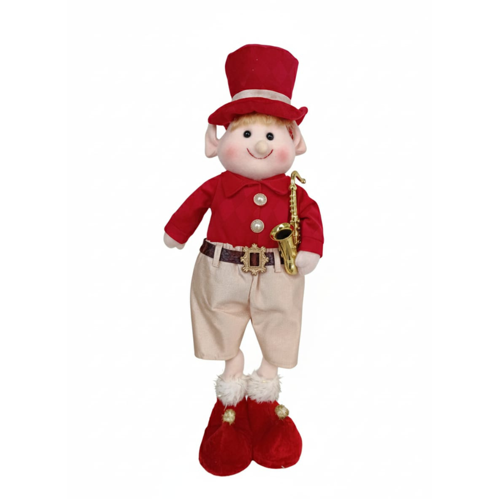 Boneco Natalino Elfo em Pé com Saxofone Vermelho e Bege – Encanto e Magia para sua Decoração de Natal!