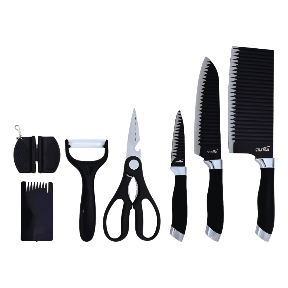 O Conjunto de 7 facas é um produto de alta qualidade, resistência e durabilidade. Suas lâminas são afiadas e de design de ângulo com o cabo ergonômico para garantir maior precisão, desempenho e o uso seguro das lâminas. As ondulações na lâmina e o revestimento antiaderente evitam que a faca fique com resquícios de alimentos. A caixa vem com fecho magnético, e é ótima para presentear.