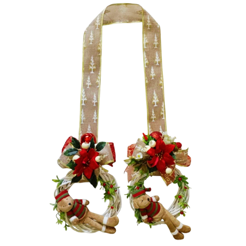Com um design encantador, o escapulário é composto por fitas aramadas delicadamente trabalhadas, cipó natural que traz rusticidade e elegância, além de ursos em pelúcia que adicionam doçura e um clima lúdico ao ambiente. Os detalhes em polipropileno garantem durabilidade, mantendo o enfeite bonito durante toda a temporada natalina.