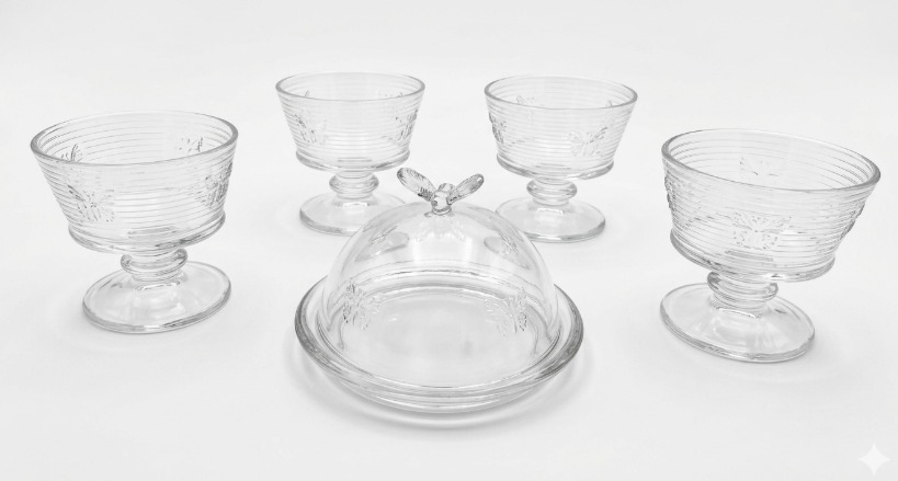 O conjunto conta com um prato com tampa em cristal, perfeito para armazenar e proteger doces com elegância, além de quatro taças em vidro com capacidade ideal para servir sobremesas individuais como mousses, pavês, gelatinas e muito mais.