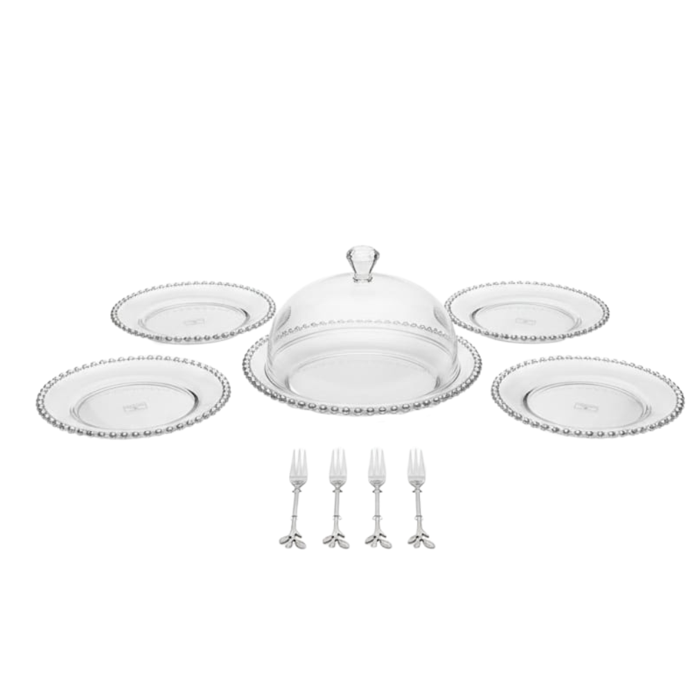 O toque de requinte para finalizar qualquer refeição. Os quatro pratos de sobremesa seguem o mesmo padrão de beleza da boleira, apresentando o sofisticado acabamento de contas em relevo ao redor da borda. Seu design transparente e brilhante é versátil, complementando qualquer cor de toalha ou decoração de mesa. São leves, elegantes e o tamanho ideal para servir fatias de bolo, tortas ou frutas.