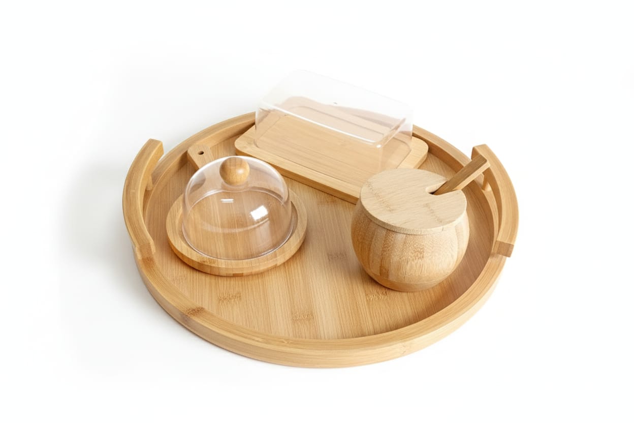 - Bandeja Redonda de Bambu (Base Principal): Com um design elegante e alças laterais, esta bandeja não é apenas uma base para as outras peças, mas um item multiuso. Perfeita para servir café da manhã, petiscos, ou como um elegante centro de mesa. Sua robustez e acabamento impecável garantem durabilidade e um toque natural a qualquer ambiente.