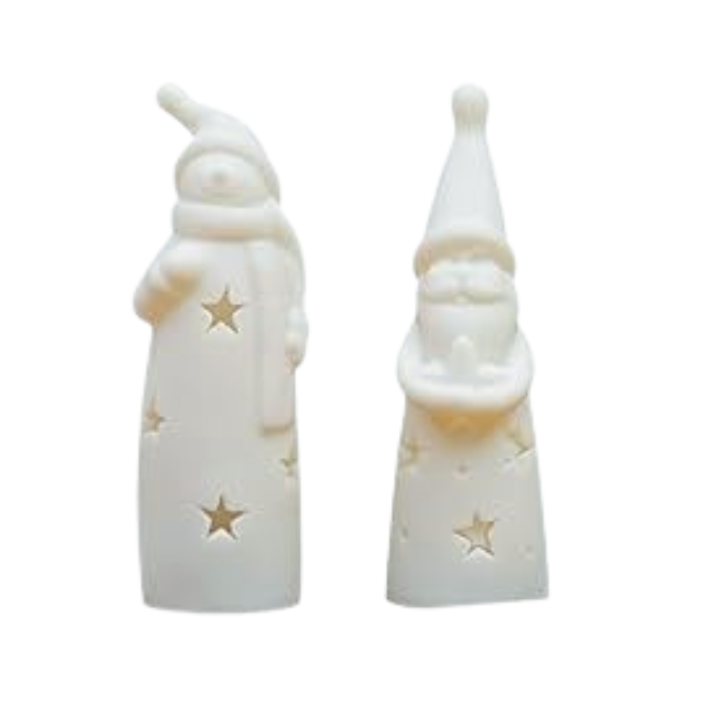 Cada figura foi cuidadosamente moldada, apresentando detalhes sutis que remetem à magia natalina o Papai Noel com seu chapéu característico e expressão acolhedora, e o Boneco de Neve com cachecol e gorro, transmitindo aconchego e alegria. Os recortes em formato de estrelas permitem que a luz (quando posicionada próxima a uma fonte luminosa ou vela LED) se projete suavemente, criando um lindo efeito iluminado e aconchegante.