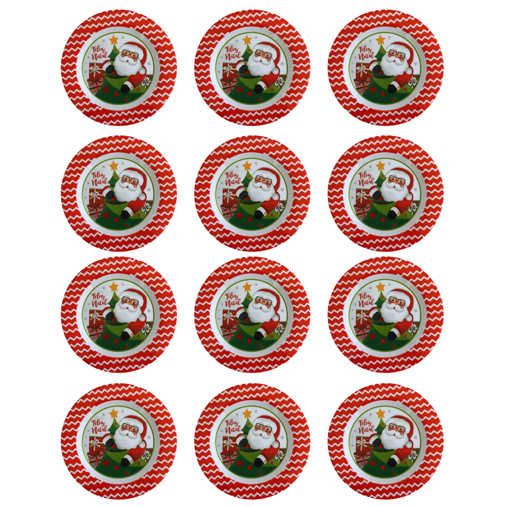 Jogo com 12 pratos fundos. Deixe sua mesa no natal mais colorida e atraente. Os pratos podem ser usados para servir entradas, caldos, massas e também podem serem usados como petisqueiras!