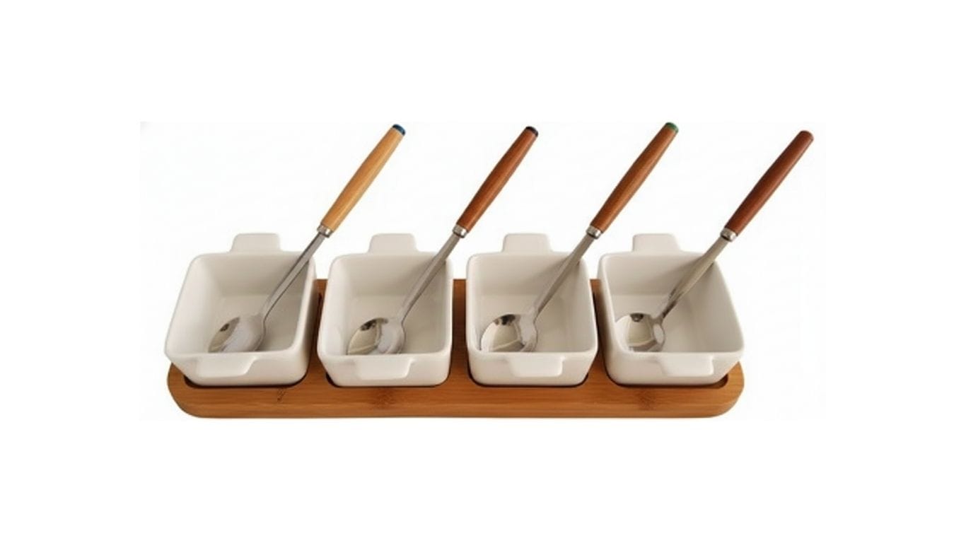 Petisqueira Tabua de Madeira com 4 Potes p/Molhos/Colheres